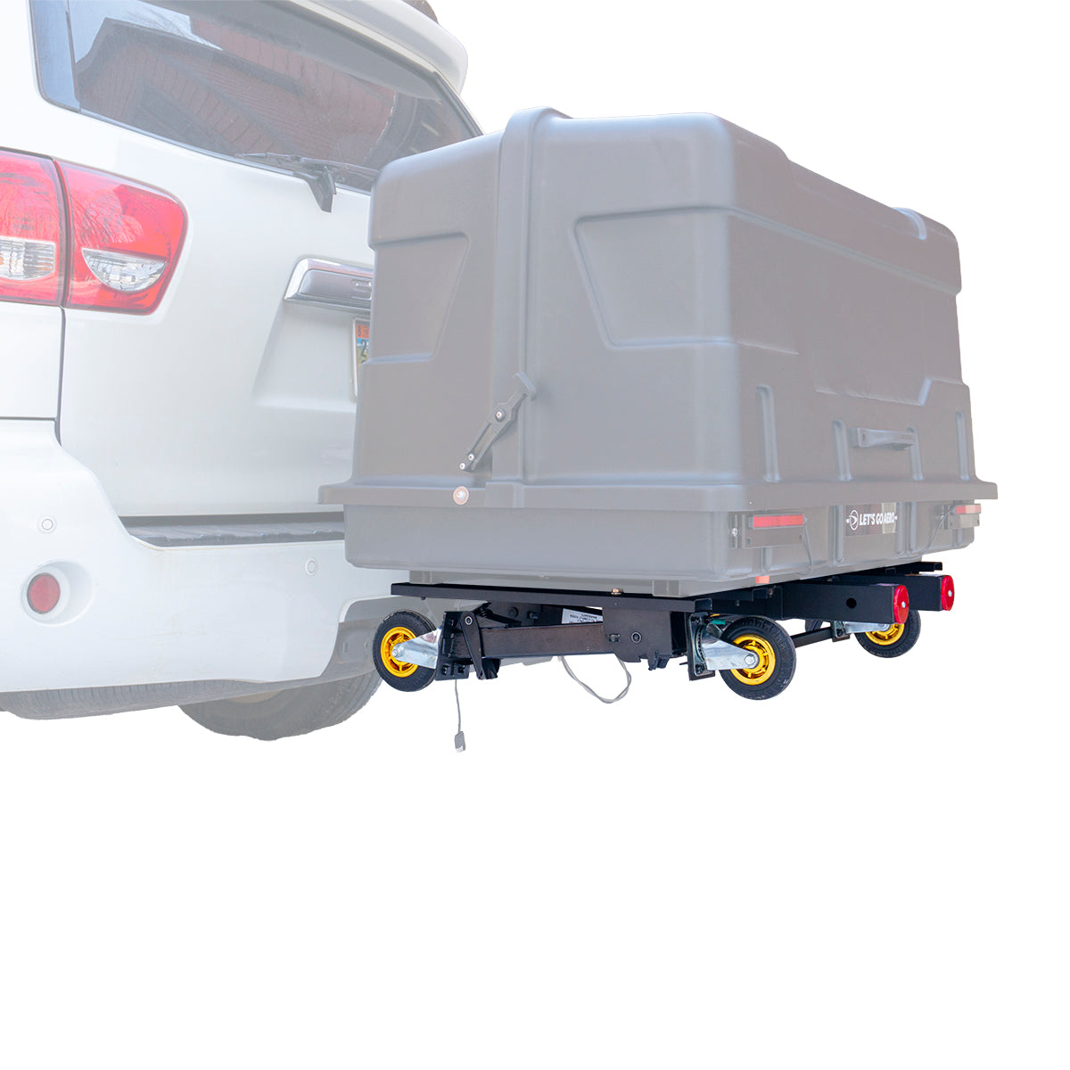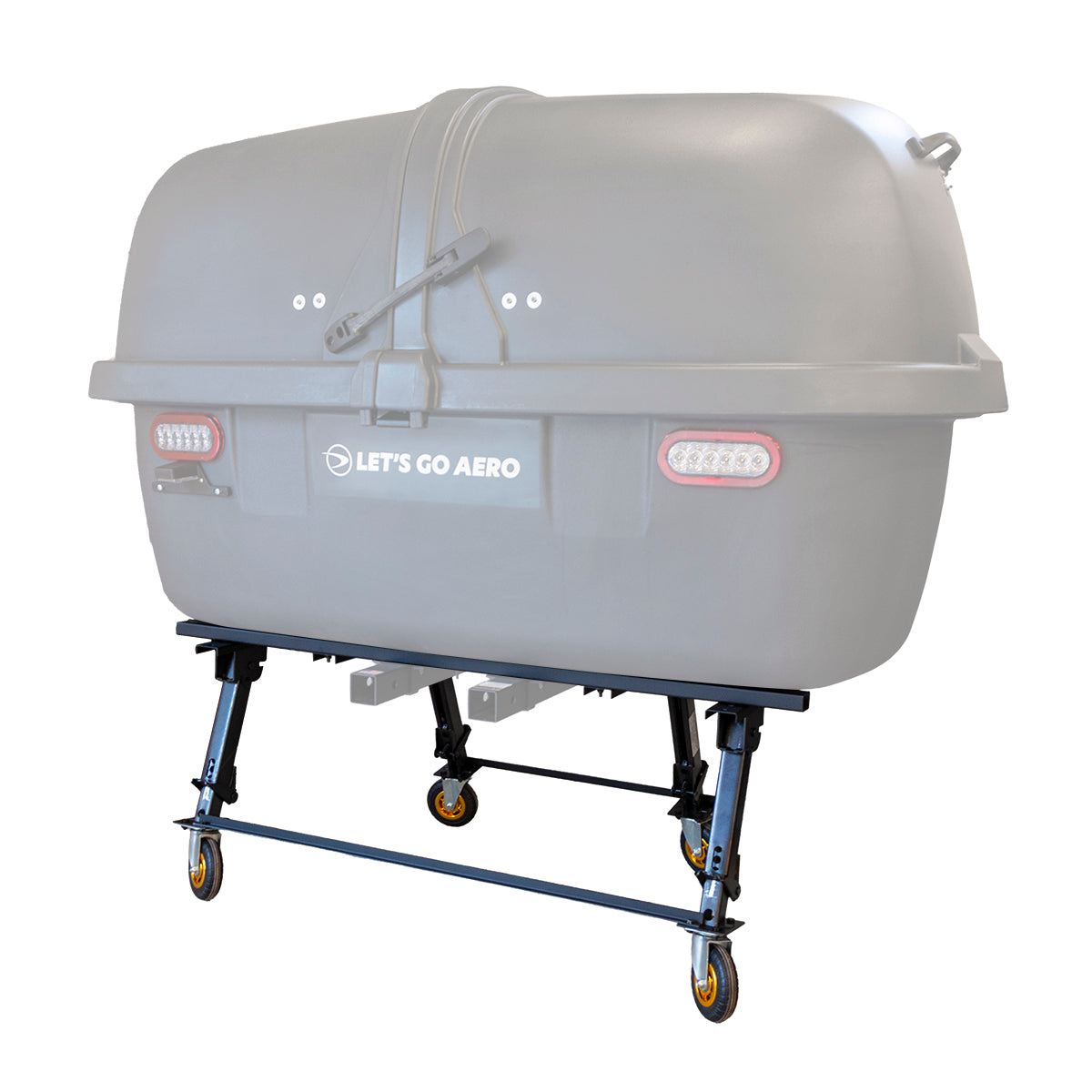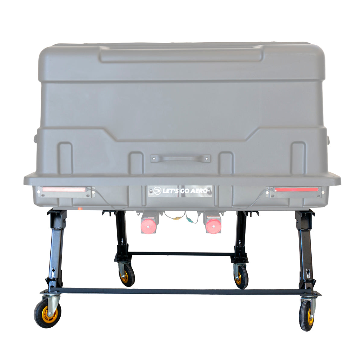 This accessory is a custom designed mobility aid for hitch installation, removal, and storage of Let’s Go Aero’s GearSpace®, GearDeck®, BlackBox and GearCage cargo carriers. The height adjustable and folding legs nest underneath the carrier for transit and are deployed with a secure catch and release mechanism for removal of the carrier from the hitch.